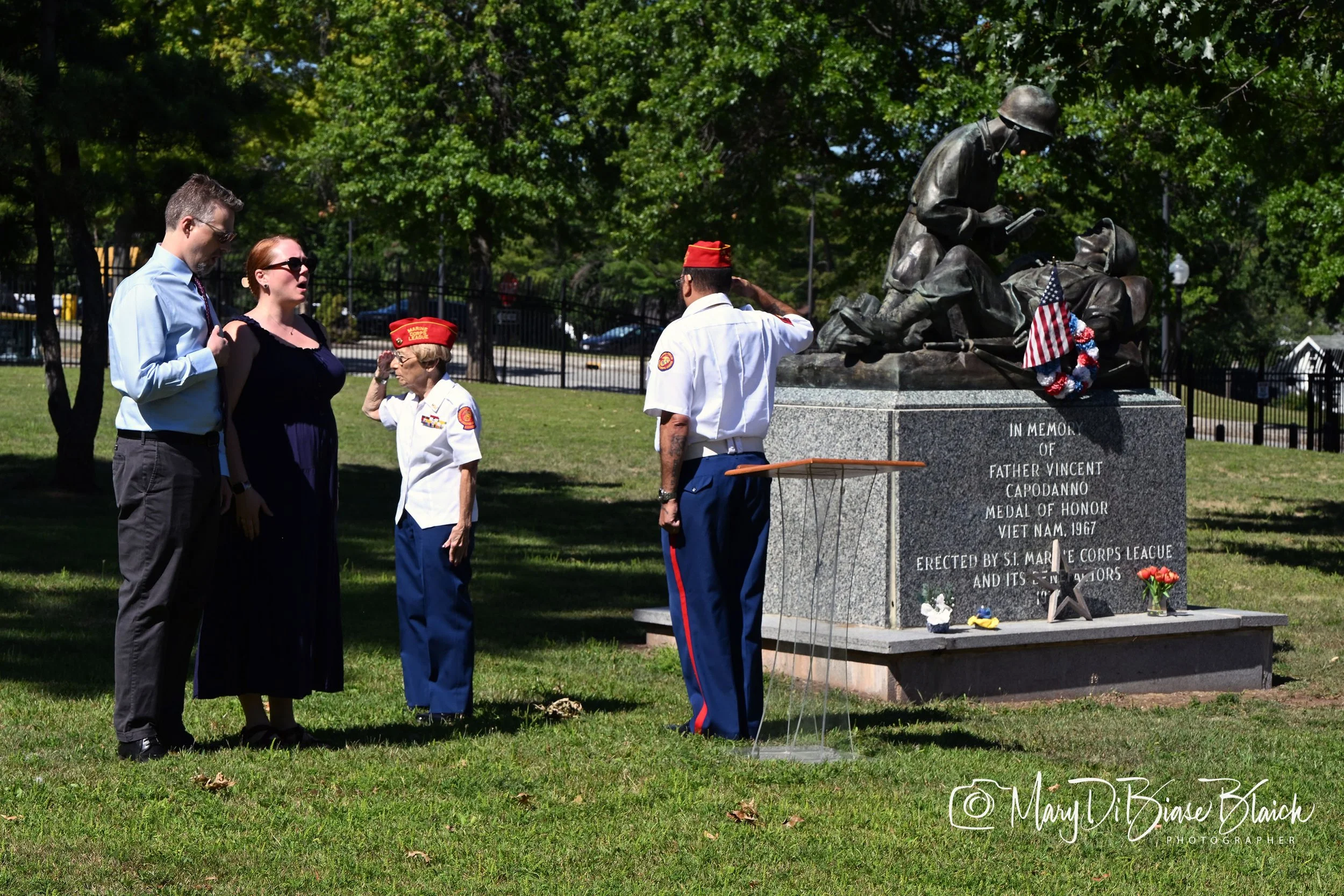 Fr Vincent R Capodanno, a Military Chaplin assigned to the Marines was killed in Vietnam 55 years ago today on September 04, 1967. He was honored with a Mass and Memorial Service at the chapel that bears his name on the grounds of Ft Wadsworth, Staten Island, New York. The service was sponsored by the Knights of Columbus and The Sons of Italy, the Marine Corps League and several other veteran organizations. The Mass was celebrated by Bishop Peter J Byrne, Episcopal Vicar, and Deacon Charles Jude Carroll. The chapel was filled to capacity with standing room only. During the Mass, Fr Capodanno’s cousin Al Lambert sang the Ave Maria. Following the Mass, the Memorial Service was held at the statue of Fr Capodanno next to the chapel. The service opened with the presentation of color from both the FDNY and the Marine Corps League. Wreaths were laid at the statue from veterans organizations, the K of C, and the Sons of Italy- Fr Vincent Capodanno Chapter. The service was concluded with a 21 gun salute by members of the Marine Corps League. Several members of the Capodanno family were in attendance.